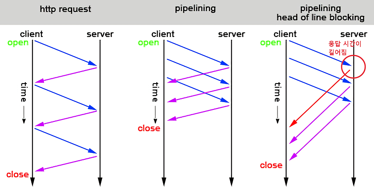 HTTP 1.1버전 부터는 지속 연결을 도입하여 이전 요청에 대한 응답을 받아야 다음 요청을 보낼 수 있었다.