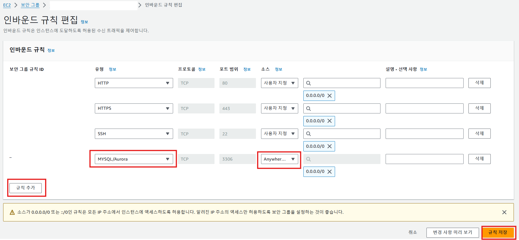 규칙 추가를 선택하고, 유형을 MYSQL로 설정하고 포트를 Anywhere/IPv4 를 선택해주면 IP가 자동으로 입력됩니다.