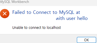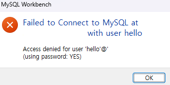 이렇게 오류가 날것이다. 위에 hello@'localhost'로만 사용자를 생성했기 때문에 오직 로컬에서만 접속이 가능하다 따라서 원격에서 접속하려면 'hello'@'%' 또는 특정 IP를 지정해주어야한다. 따라서 mysql에 다시 접속한 후