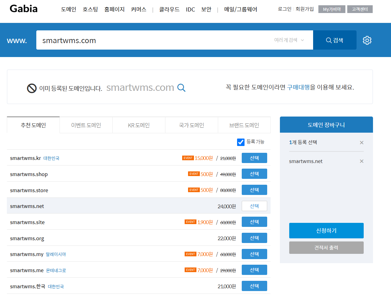 1️⃣ 가비아에서 원하는 도메인을 입력합니다.