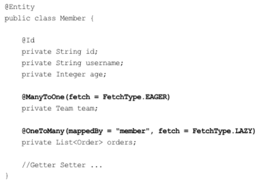JPA 기본 페치 전략은 연관된 엔티티가 하나면 즉시 로딩을, 컬렉션이면 지연 로딩을 사용한다. 컬렉션을 로딩하는 것은 비용이 많이 들고 잘못하면 너무 많은 데이터를 로딩할 수 있기 때문이다. 추천하는 방법은 모든 연관관계에 지연 로딩을 사용하는 것이다.