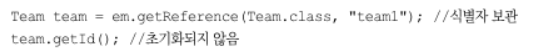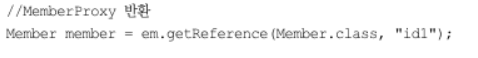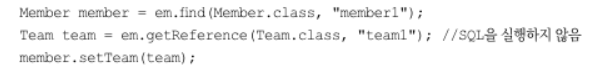 이렇게 조회하면 엔티티를 실제 사용하든 사용하지 않든 DB를 조회하게 된다. 엔티티를 실제 사용하는 시점까지 DB조회를 미루고 싶으면 EntityManager.getReference()메서드를 사용하면 된다.