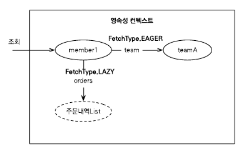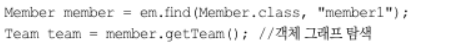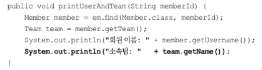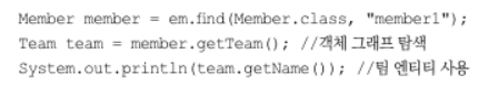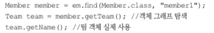 ex) em.find(Member.class, "member1")는 회원 엔티티와 함께 팀 엔티티도 함께 조회한다.