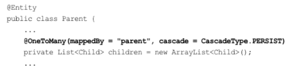 일반적으로 엔티티는 EntityManager.persist()를 통해 영속화되고 EntityManager.remove()를 통해 제거된다. 이것은 엔티티 스스로 생명주기를 관리한다는 뜻이다. 그런데 두 옵션을 모두 활성화하면 부모 엔티티를 통해서 자식의 생명주기를 관리할 수 있다.