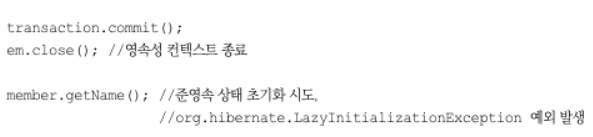 - 초기화는 영속성 컨텍스트의 도움을 받아야 가능하다. 따라서 영속성 컨텍스트의 도움을 받을 수 없는 준영속 상태의 프록시를 초기화하면 문제가 발생한다. 하이버네이트는 org.hibernate.LazyInitializationException 예외를 발생한다.