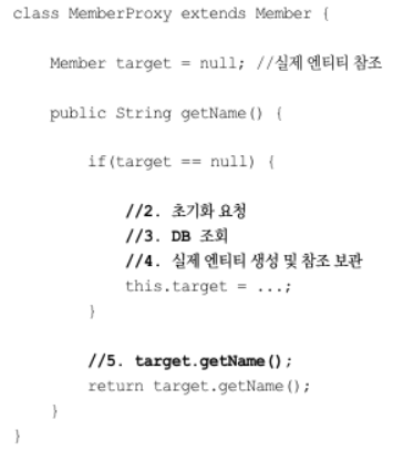 - 프록시 객체는 생성된 실제 엔티티 객체의 참조를 Member target 멤버변수에 보관한다.