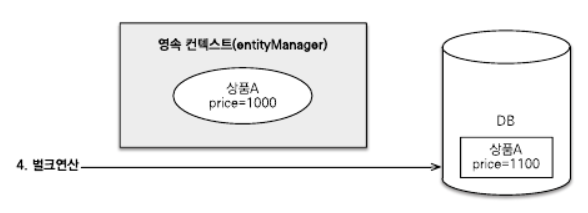 영속성 컨텍스트를 무시하고 DB에 직접 쿼리한다는 점에 주의하자. 다음은 벌크 연산시 문제가 발생한 예제이다. DB에는 가격이 1000원인 상품A가 있다.