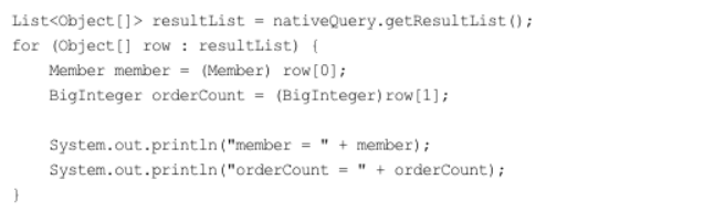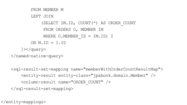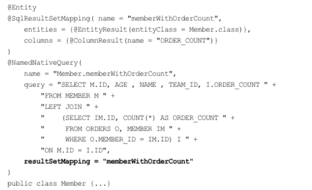 Named 네이티브 쿼리에서 resultSetMapping = "memberWithOrderCount"로 조회 결과를 매핑할 대상까지 지정했다. 다음으로 사용하는 코드이다.