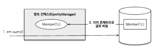 JPQL로 DB에 조회한 엔티티가 영속성 컨텍스트에 이미 있으면 JPQL로 DB에서 조회한 결과를 버리고 대신에 영속성 컨텍스트에 있던 엔티티를 반환한다.