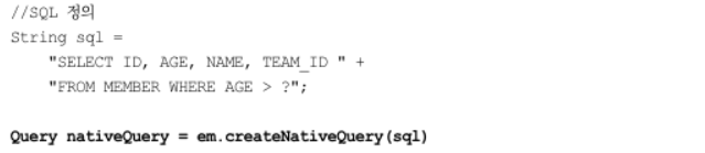 다양한 이유로 JPQL을 사용할 수 없을 때 JPA는 SQL을 직접 사용할 수 있는 기능을 제공, 이것을 네이티브 SQL이라 한다.