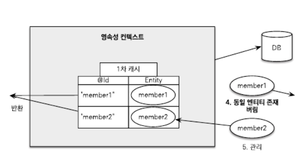 - 식별자 값을 기준으로 member1은 이미 영속성 컨텍스트에 있으므로 버리고 기존에 있던 member1이 반환 대상이 된다.