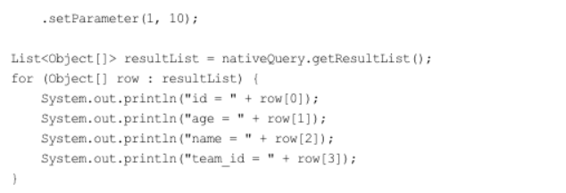 단순히 값으로 조회했다. 이렇게 여러 값으로 조회하려면 em.createNativeQuery(SQL)의 두 번째 파라미터를 사용하지 않으면 된다. 마치 JDBC로 데이터를 조회한 것과 비슷하다. (결과를 영속성 컨텍스트가 관리 X)