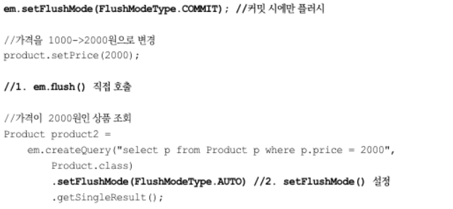 만약 플러시 모드를 COMMIT으로 설정하면 조회할 수없다. 이때는 직접 em.flush()를 호출하거나 다음 코드처럼 Query객체에 밑과 같이 플러시 모드를 설정해 주면 된다.