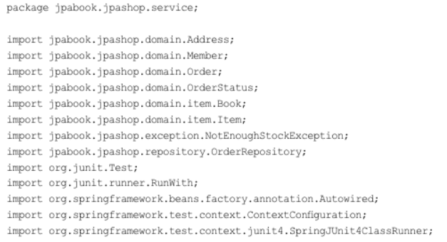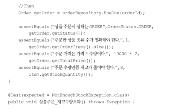상품 주문이 정상 동작하는지 확인하는 테스트다. Given 절에서 테스트를 위한 회원과 상품을 만들고 When 절에서 실제 상품을 주문하고 Then 절에서 주문 가격이 올바른지, 주문 후 재고 수량이 정확히 줄었는지 검증한다.