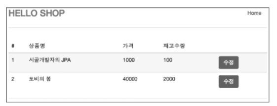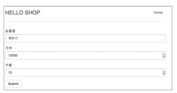 Submit 버튼을 클릭하면 /items/new를 POST 방식으로 요청한다. 그러면 요청 정보와 매핑되는 상품 컨트롤러의 create(Book item) 메서드를 실행한다. 이 메서드는 상품 서비스에 상품 저장을 요청하고 저장이 끝나면 상품 목록 화면으로 리다이렉트한다.
