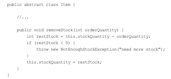 - removeStock() 메서드는 파라미터로 넘어온 수만큼 재고를 줄인다. 만약 재고가 부족하면 예외가 발생한다. 주로 상품을 주문할 때 사용한다.