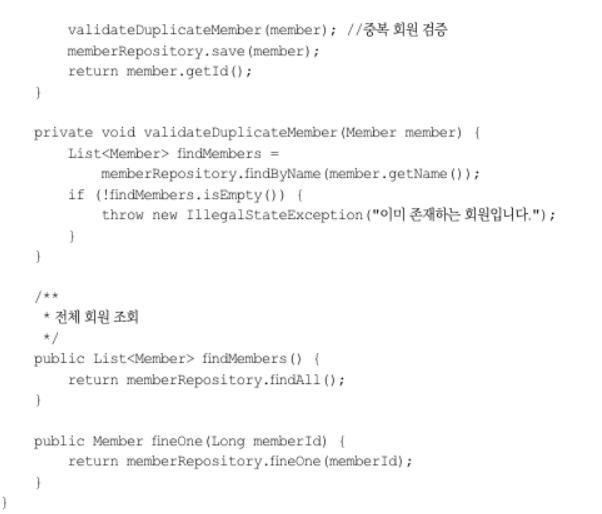 join() 메서드를 사용한다. 이 메서드는 먼저 validateDuplicateMember()로 같은 이름을 가진 회원이 있는지 검증하고 검증을 완료하면 회원 리포지토리에 회원 저장을 요청한다. 만약 같은 이름을 가진 회원이 존재해서 검증에 실패하면 "이미 존재하는 회원입니다." 라는 메시지를 가지는 예외가 발생한다. 회원가입에 성공하면 생성된 회원 식별자를 반환한다.