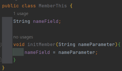 이렇게 nameField 앞에 this가 없어도 멤버 변수에 접근합니다. nameField는 먼저 지역변수(매개변수)에서 같은 이름이 있는지 찾습니다. 이 경우 없으므로 멤버 변수에서 찾습니다.